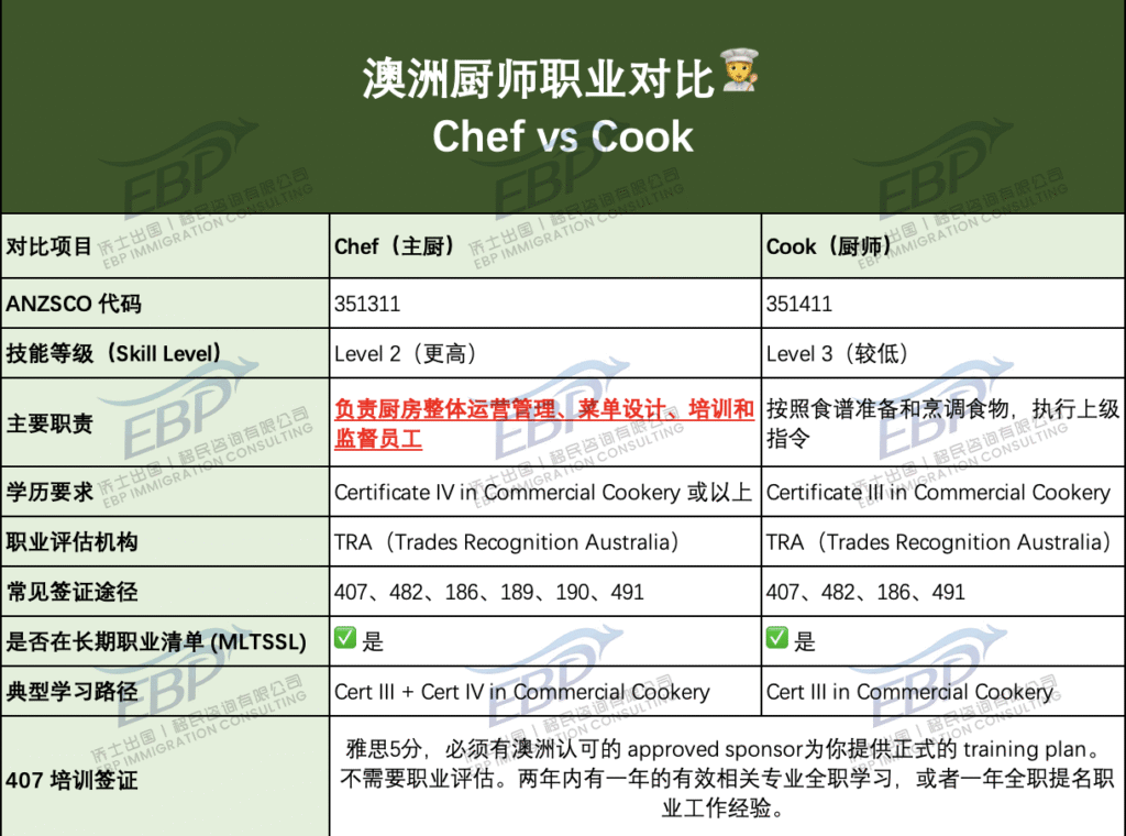 因为对于准备走 Cook 或 Chef 移民的人来说407 Training Visa 很可能就是你翻盘的关键。为什么很多做厨师移民的人卡在“经验不足”?Cook 和 Chef 这两个职业都在澳洲长期紧缺职业清单(MLTSSL)上,意味着